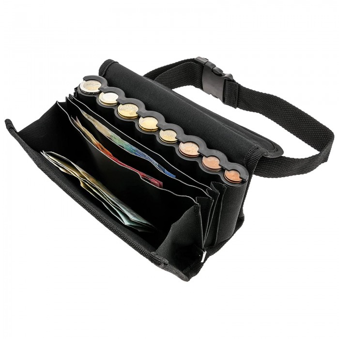 Este saco de dinheiro portátil com distribuidor de moedas e cinto é uma solução eficiente, conveniente e confortável para qualquer pessoa que manuseie transações em dinheiro em movimento.