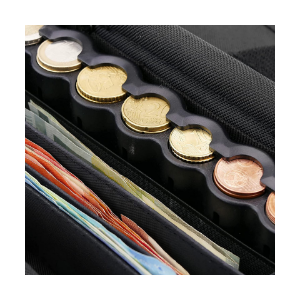 O distribuidor de moedas de plástico ABS preto inclui 8 tubos, um para cada denominação de moeda de Euro, e um sistema de mola que facilita o armazenamento e remoção de moedas. O doseador está localizado no último compartimento da bolsa, o que permite uma entrega rápida e fácil de trocos com apenas uma mão. Os caixas podem também facilmente trocar no final do seu turno com o dinheiro organizado e classificado.